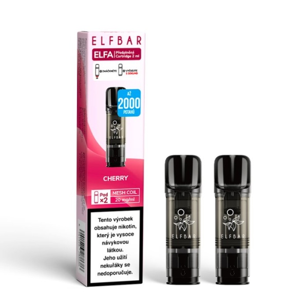 Předplněné cartridge Elf Bar ELFA s třešňovou příchutí, 2ml liquidu s 20mg nikotinové soli, pro rychlé vstřebání a hladký zážitek.